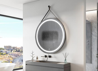 A round illuminated mirror is attached to a leather strap available in three colour variants: black, light brown and dark brown. The personalisation option makes it possible to match the mirror to your own preferences and interior style. Stylish genuine leather strap.